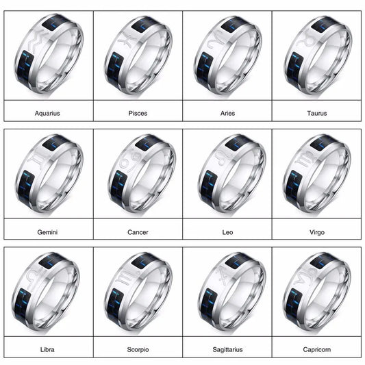 Vnox Twelve Constellations Rings for Men Women 8mm Stainless Steel Anel Male Classic Carbon Fiber 12 Horoscope Ring