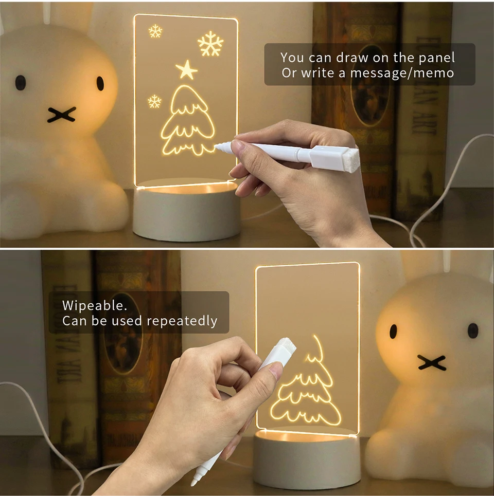 This board lamp is with a free pen as a gift, you can leave message with this pen. The messages are easily removed by the eraser on pen top.